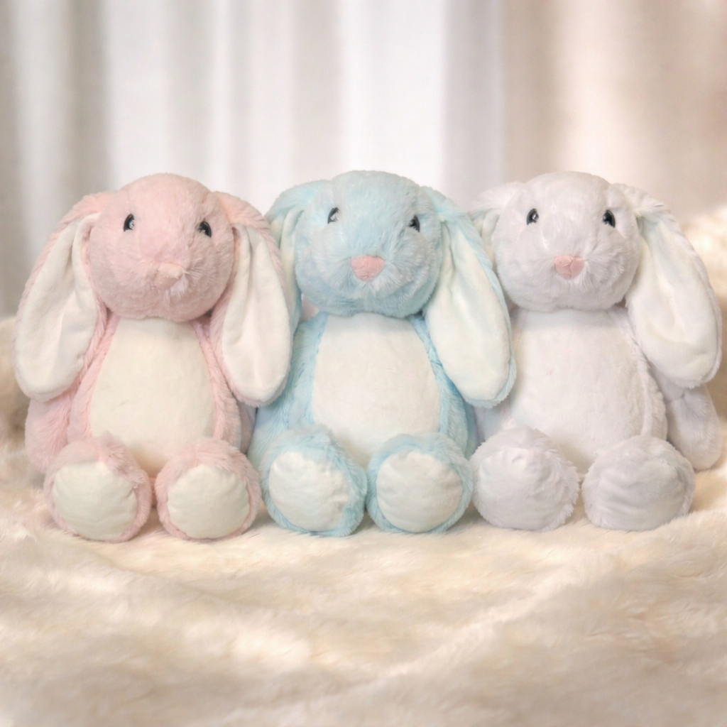 Available in gentle pastel colours, each bunny can be customised with any photo, design, or text, making it a truly unique gift.